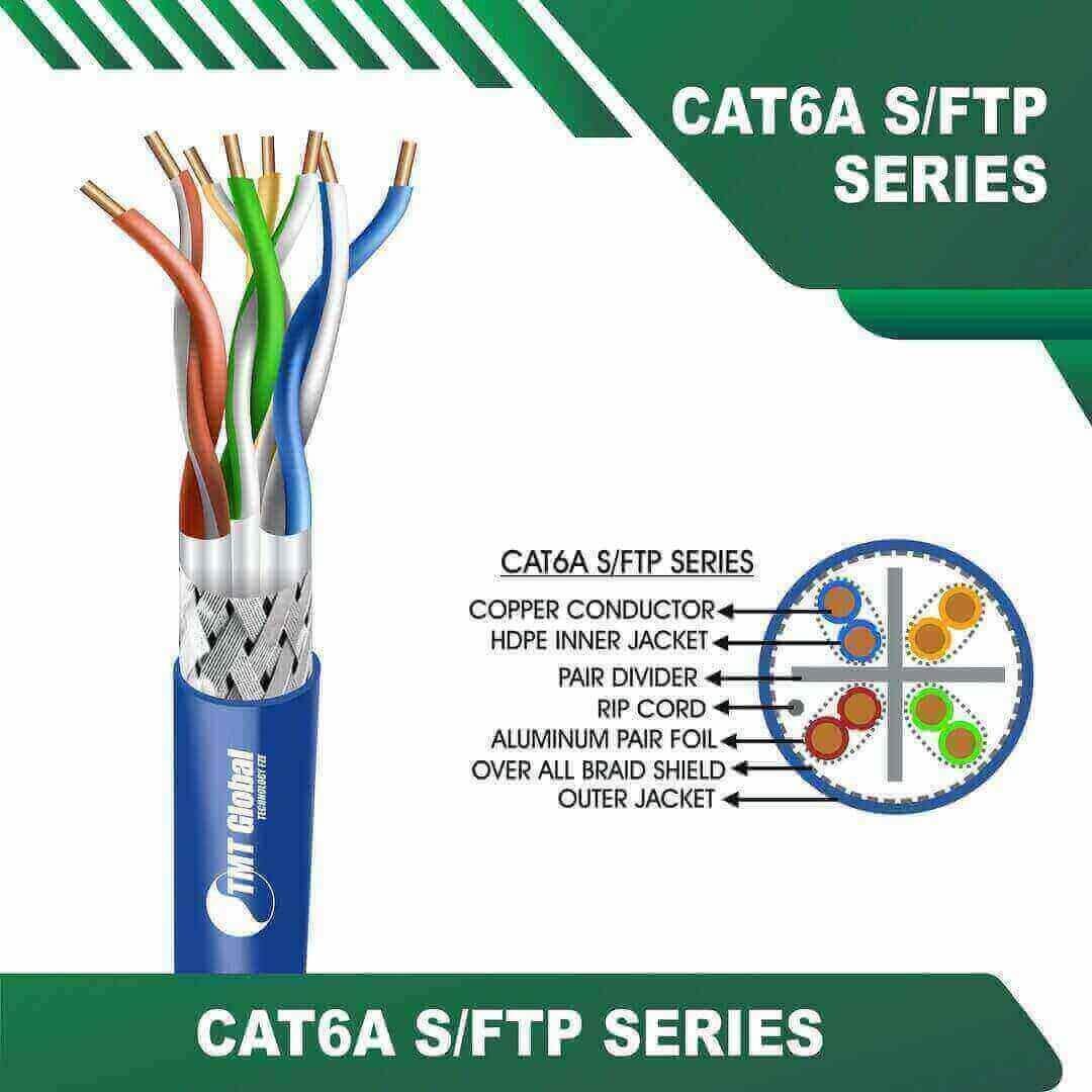 TMT Global cat6a stp cable 23awg 4 twisted pair 305m are Manufactured Tested and Complied with IEC 60332-1-2 EN 50173-1:2011 ISO/IEC11801:2011(Ed. 2.2) ANSI/TIA/EIA-568.2-D IEC61935-2:2010(Ed.3.0) EN 50173-2:2007 including Amendment A1:2010 Requirements for Patch Cord Assemblies and Provide High Performance levels for structured cabling systems.Cat6a 23awg 4 twisted pair S-FTP Data Cable 305m