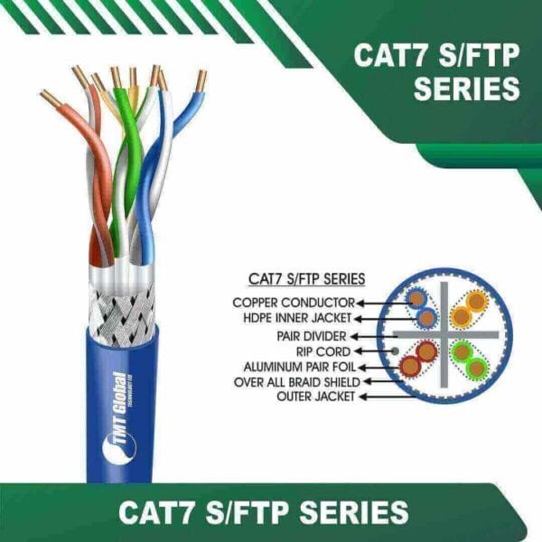 TMT Global cat7 cable 23 awg 4 twisted pair SFTP Bulk Cable 305m are Manufactured Tested and Complied with IEC 60332-1-2 EN 50173-1:2011 ISO/IEC11801:2011(Ed. 2.2) ANSI/TIA/EIA-568.2-D IEC61935-2:2010(Ed.3.0) EN 50173-2:2007 including Amendment A1:2010 Requirements for Patch Cord Assemblies and cat7 Provide High Performance levels for structured cabling systems. Cat7 23awg 4 twisted pair S-FTP Bulk Cable 305m