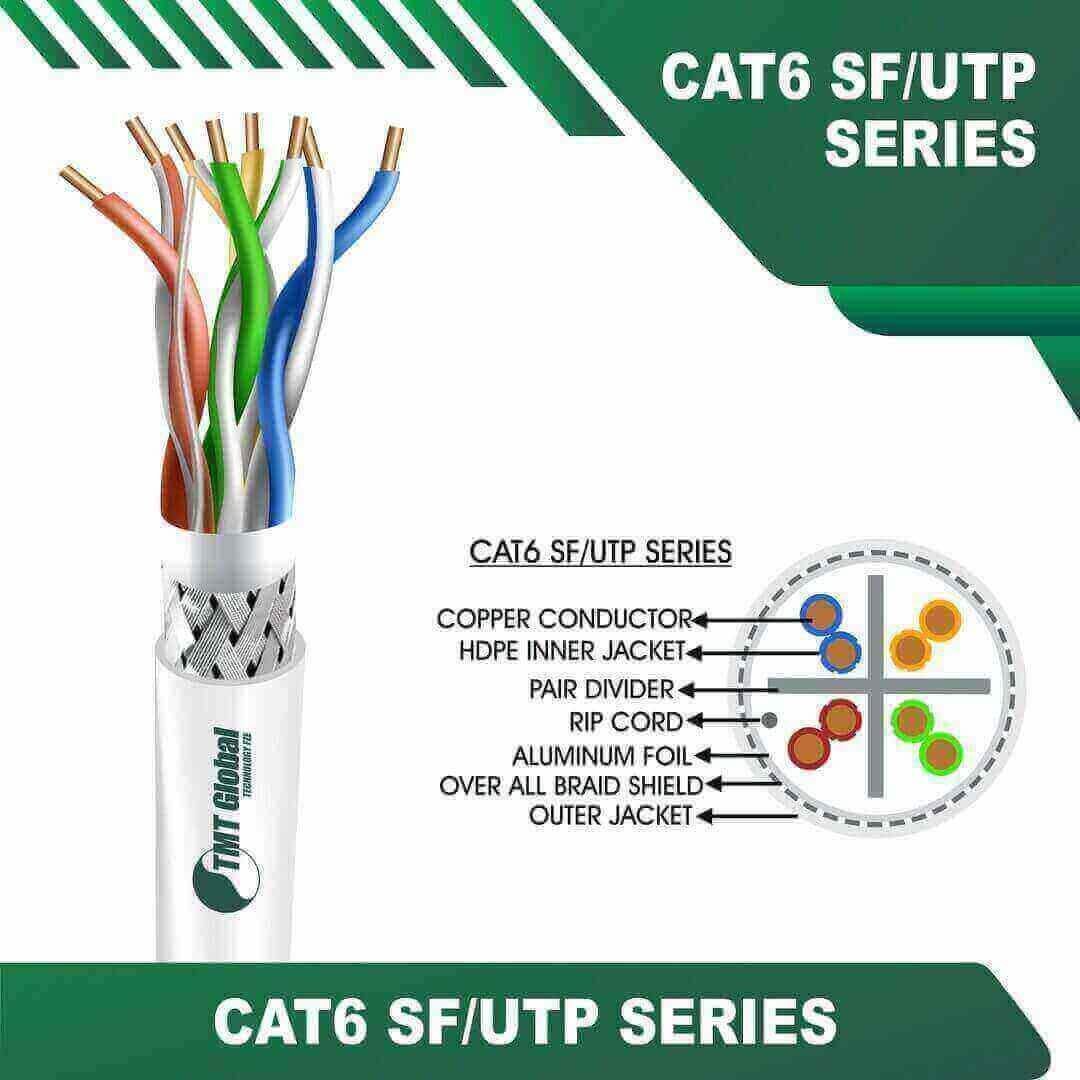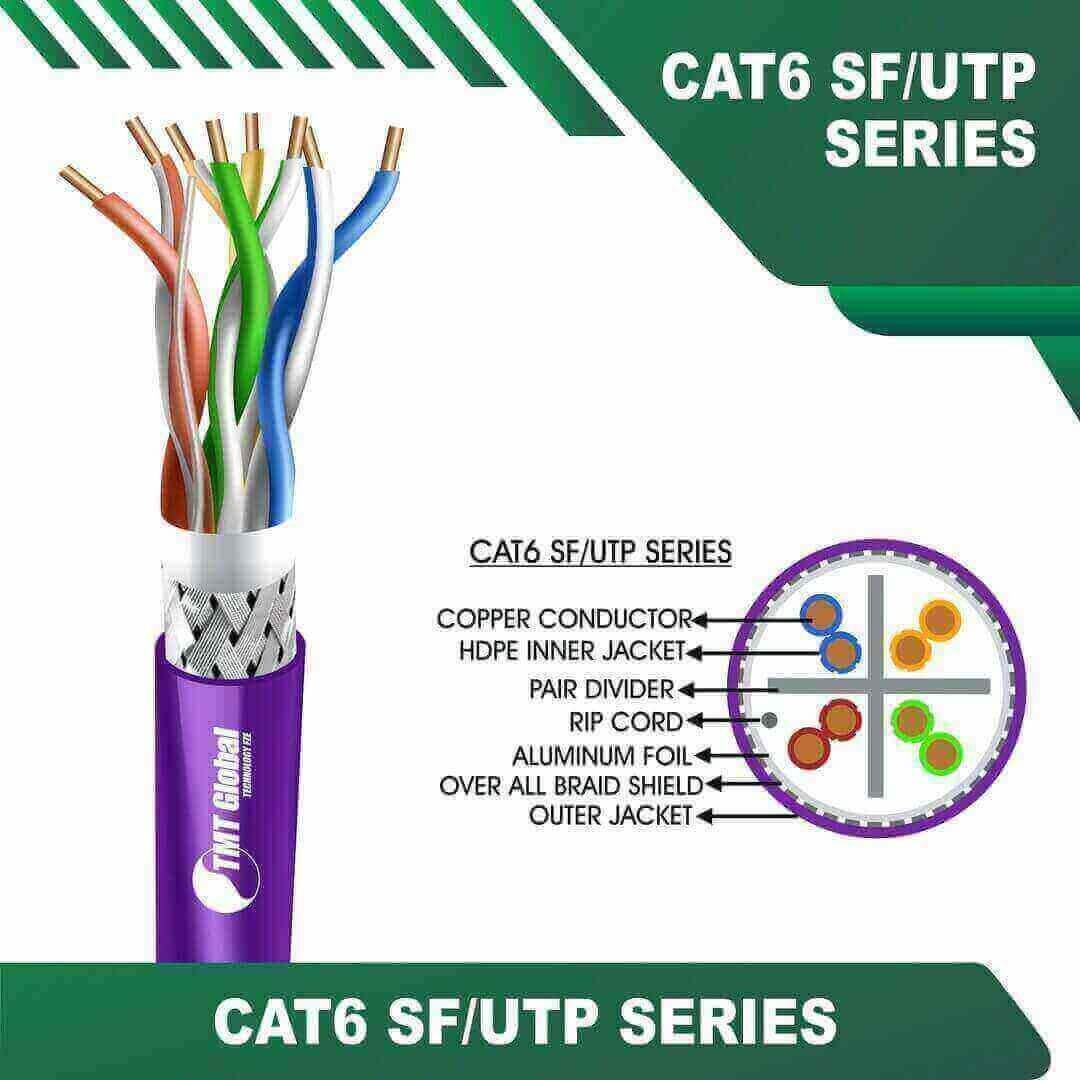 TMT Global SF/UTP Solid Cable Cat6 23awg 4 twisted pair 305m are Manufactured Tested and Complied with IEC 60332-1-2 EN 50173-1:2011 ISO/IEC11801:2011(Ed. 2.2) ANSI/TIA/EIA-568.2-D IEC61935-2:2010(Ed.3.0) EN 50173-2:2007 including Amendment A1:2010 Requirements for Patch Cord Assemblies and Provide High Performance levels for structured cabling systems. Cat6 23awg 4 twisted pair SF-UTP Solid Cable 305m